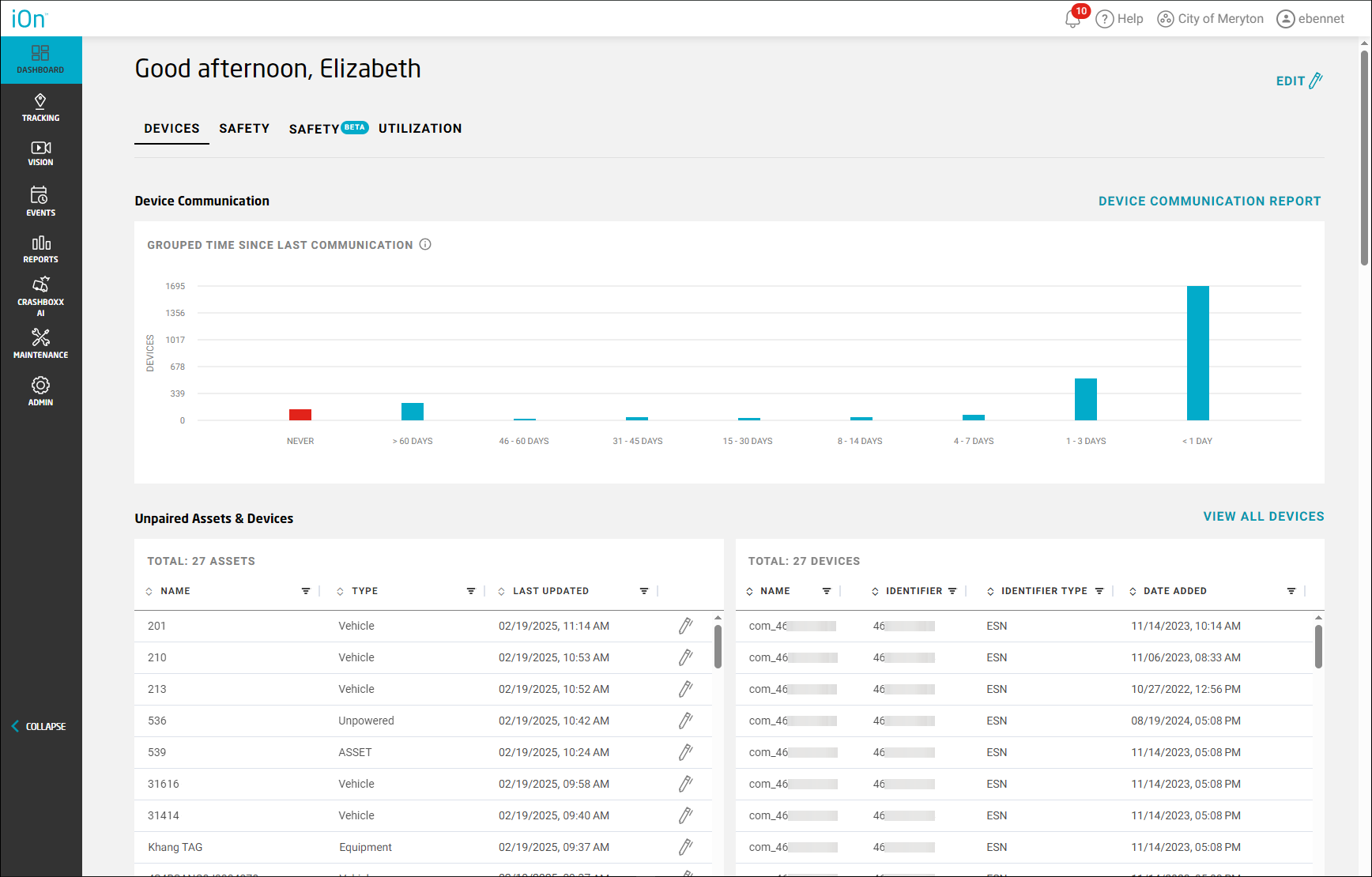 - Devices: Shows how many devices haven't reported to CalAmp recently, which assets have no associated devices, and which devices are not assigned to an asset. (See Viewing Device Data on the Dashboard.)
