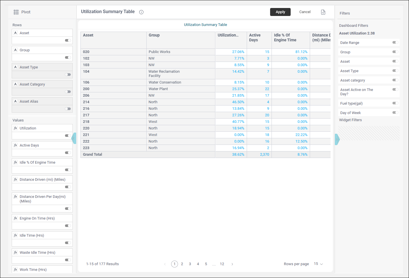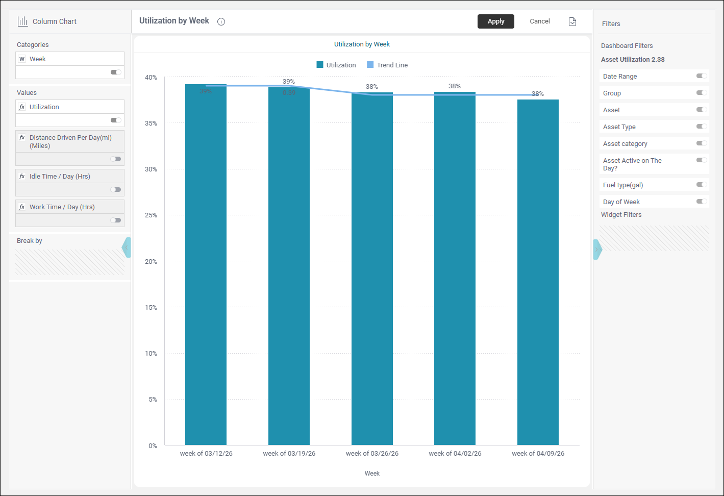 When you open the Utilization Dashboard, it will be populated with data for the last 30 days for all your groups and assets or drivers, but you can change the date range and limit other results by using the Filters panel on the right as follows: