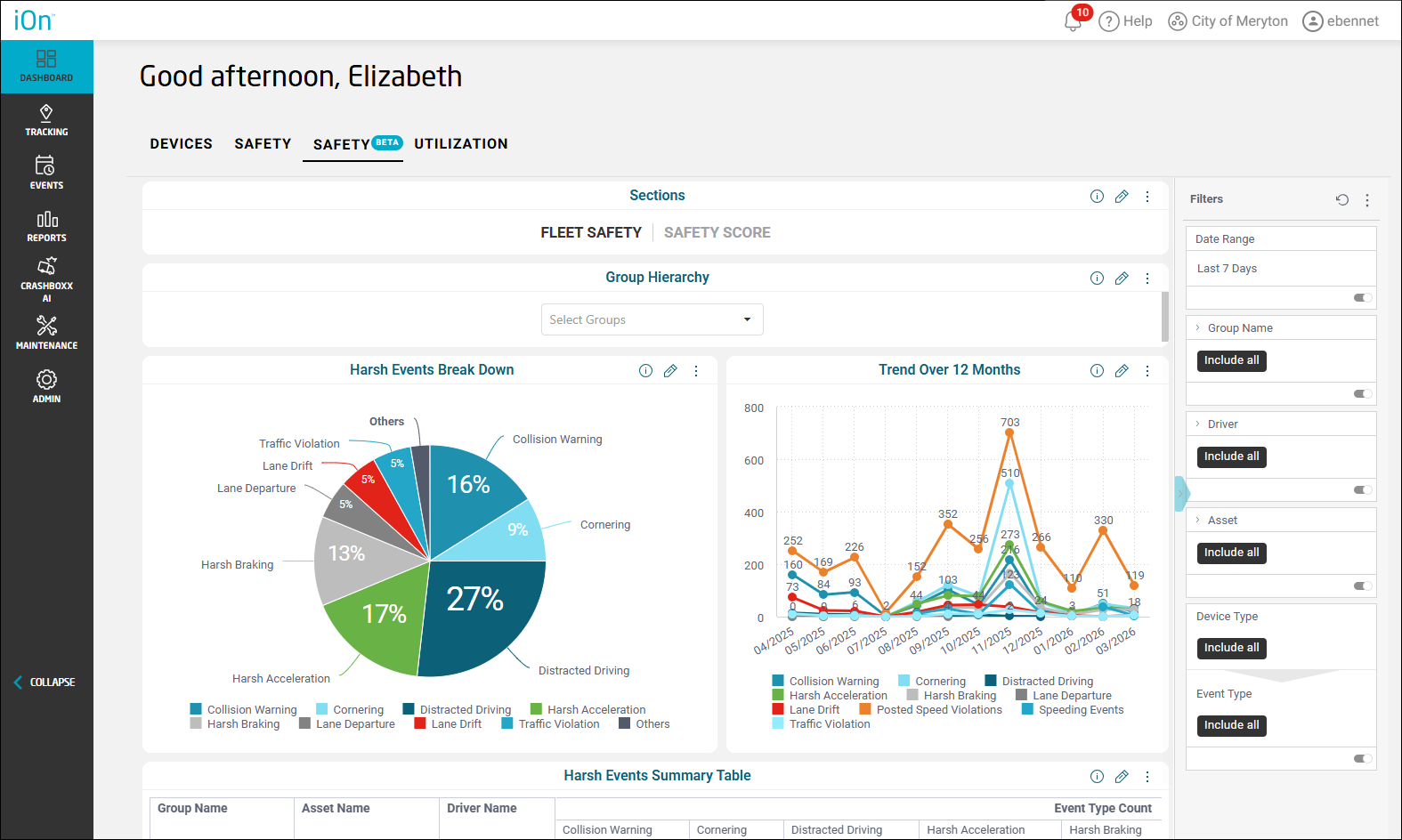 The Dashboard provides key information about your fleet's overall performance in an at-a-glance view. The Safety Beta tab is a new Dashboard and has been designed as an improvement over our original Safety Dashboard. It has charts and graphs that show your harsh event safety violations by type, your total number of harsh events from month to month, your overall fleet safety score, how many harsh events each driver has triggered, and driver score card data.