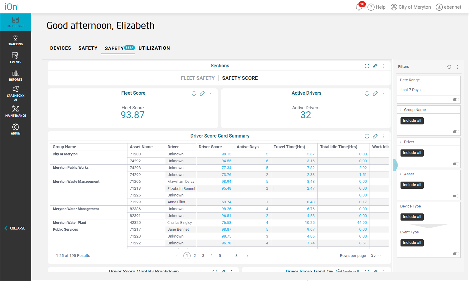 to restore the filters to view.) - In the Sections area at the top, click Safety Score for driver safety score data.