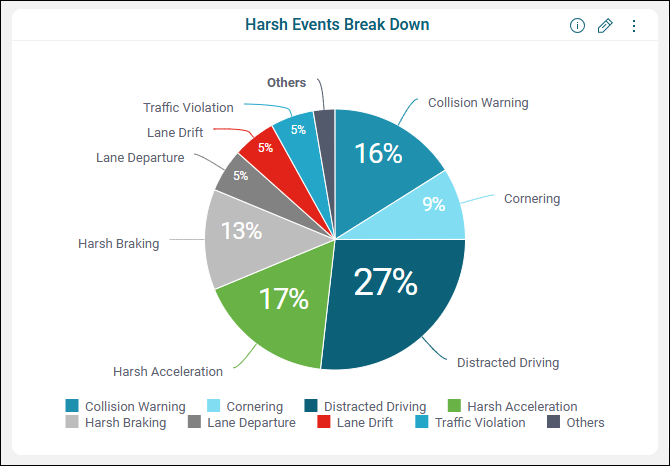 The Harsh Events Break Down tile contains a pie chart with the percentages of harsh event safety violations by type, such as Collision Warning, Cornering, and Distracted Driving. Each pie slice shows both the percentage of a violation type and the number of occurrences of that event over the course of the time period (when you mouse over it). The events are color-coded by type, with the legend underneath the pie chart. You can click a category in the legend to have it removed from the chart.