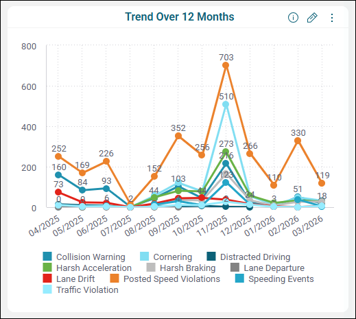 The lines of the Trend Over 12 Months graph represent the total number of each harsh event type from month to month for the last 12 months, so you can see how the violations are trending over the past year. Again, the harsh events are color-coded, with an explanatory legend below the line graph. You can click a category in the legend to have its data removed from the chart.