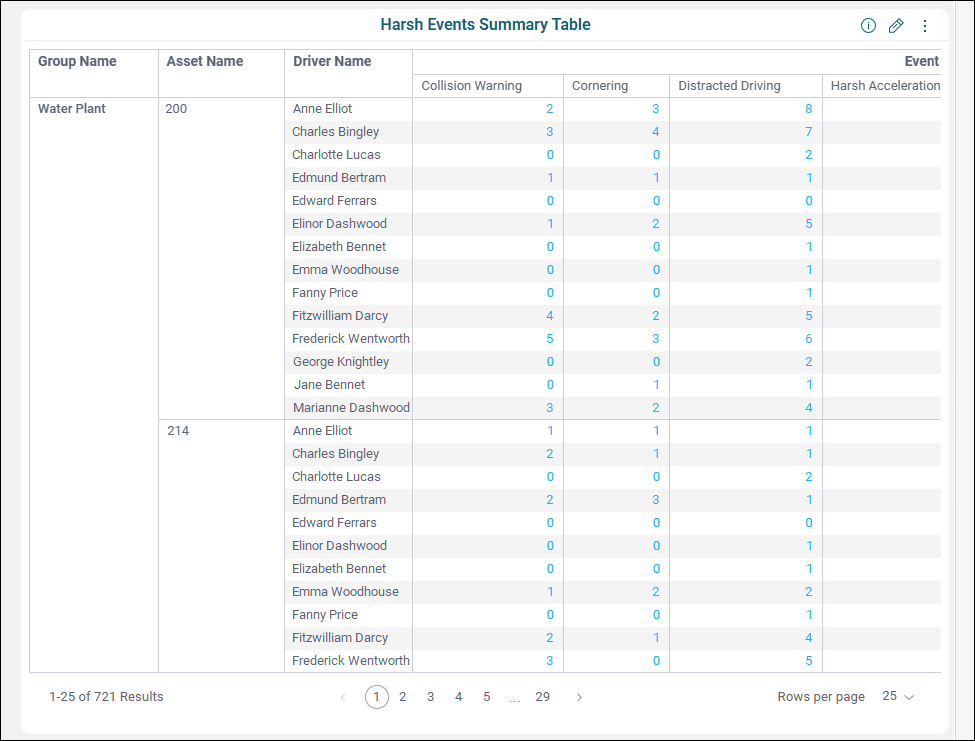 The Harsh Events Summary Table tile lists your drivers by name and displays the count of each harsh event they are responsible for over the course of the chosen time frame on each asset they drove, organized by group.