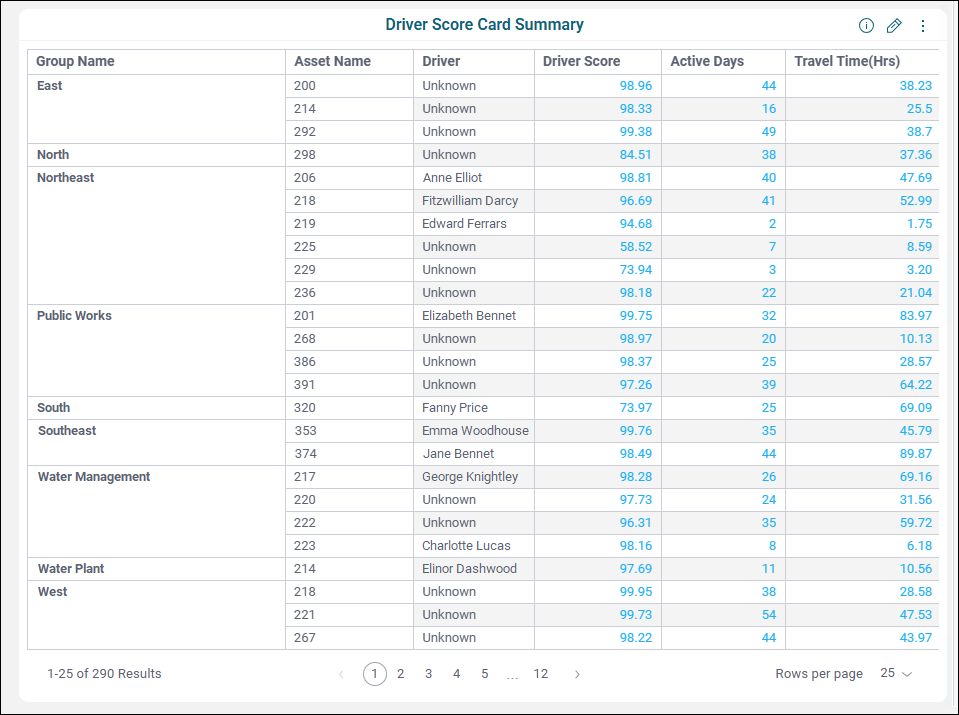 On the Driver Score Card Summary tile is a grid of driver score card data, with each driver and asset separated by their assigned group, including driver scores, the number of days they were active for the date range, their travel time, idle time, distance driven, speeding events, and maximum speed. Make sure that you scroll to the right to show the columns you can't see at first.