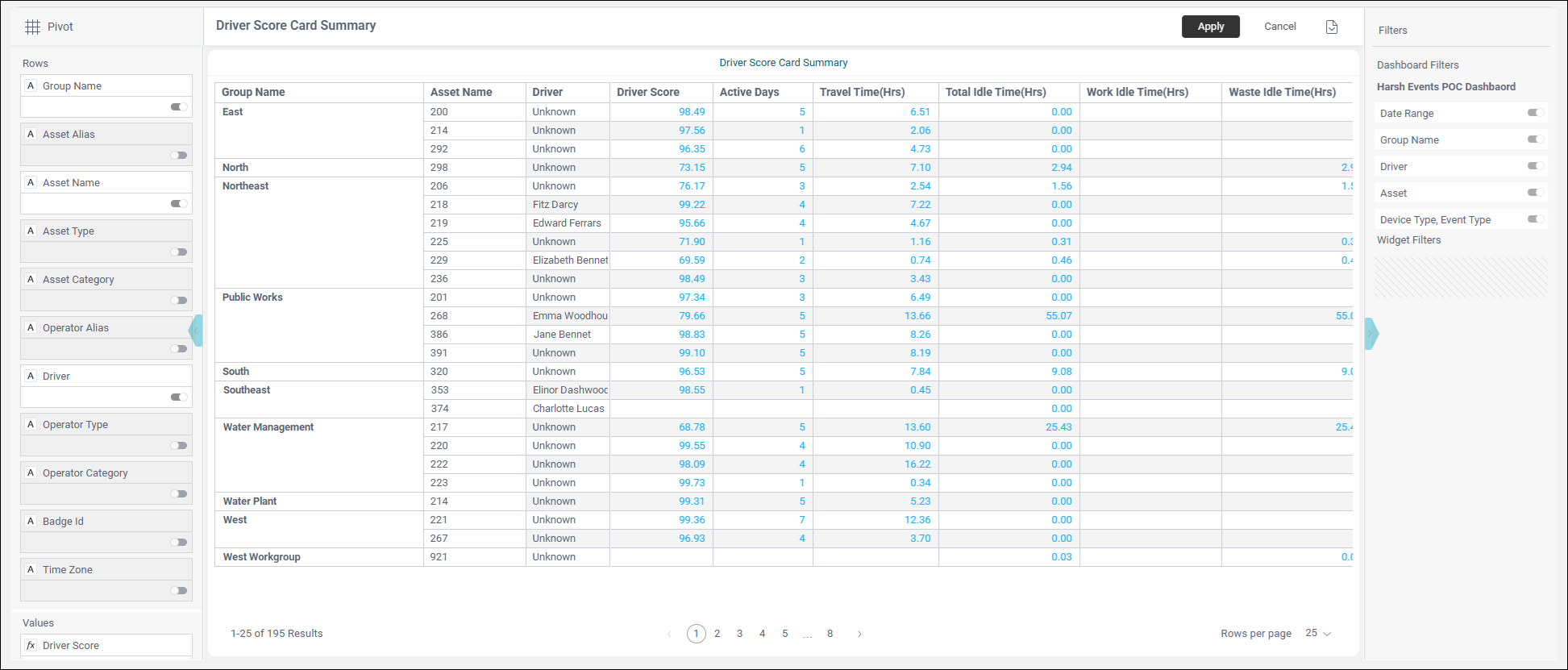 Note: You should only use this method on the Fleet Safety section's Harsh Events Summary Table widget and on the Safety Score section's Driver Score Card Summary and Driver Score Monthly Breakdown tables. The