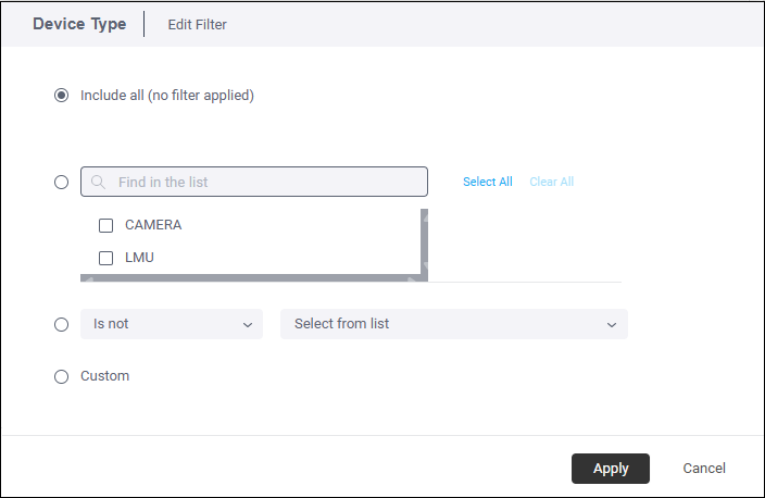 - To choose just one device type, select the radio button to the left of Find in the List.